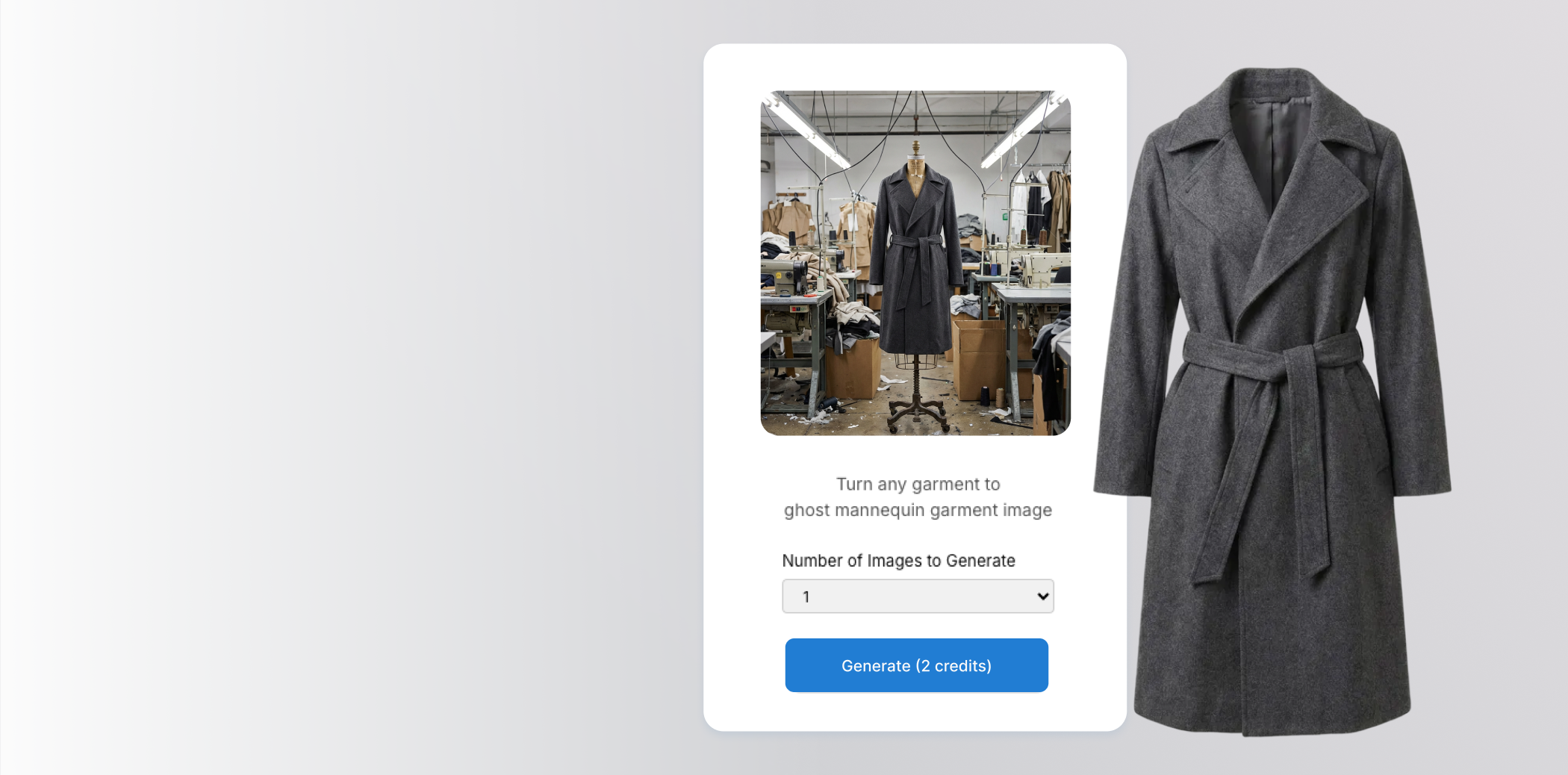 Upload any garment photo — flatlay, on-model, or on a hanger — and get a clean ghost mannequin effect in seconds. No manual editing or Photoshop required.